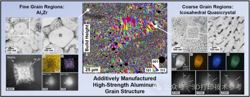NIST researchers investigated the as-printed microstructure of 7A77 aluminum alloy across multiple length scales. Analysis showed that laser 3D printing introduced various metastable phases into its microstructure. Specifically, they identified a distinct bimodal microstructure in the 3D-printed 7A77: fine equiaxed grains containing Al₃Zr phases and coarser grains with icosahedral quasicrystalline characteristics—previously unreported in such alloys. The fine equiaxed grains distribute near the melt pool boundaries, while the melt pool center features coarser, elongated grains.