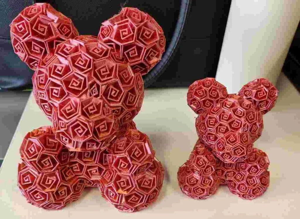 This adorable bear is fully textured with tiny roses, combining a teddy bear and a rose bouquet in one gift! Standing ~10cm tall, its design prints without supports despite complex geometry. The designer recommends scaling no lower than 75% for optimal results—likely due to thin rose walls—though some makers report acceptable outcomes at 60%.