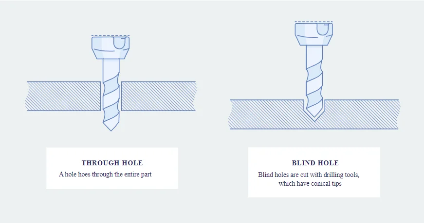 - Blind Holes vs. Through Holes: Blind holes do not pass through the part, while through holes do. Understanding this distinction is vital for making informed choices during the design and machining phases.