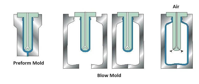 - Two-stage: The preform is molded, then reheated, and then blow-molded.