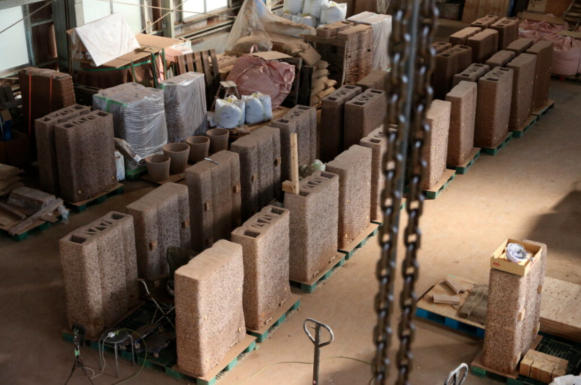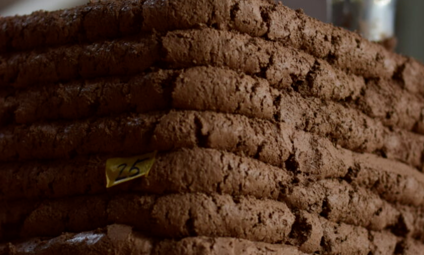 Soil is mixed with seaweed as a binder, along with straw and clay. The structure is biodegradable, and the printed objects themselves are hardened with magnesium oxide. The entire structure was 3D-printed indoors and then installed on-site.