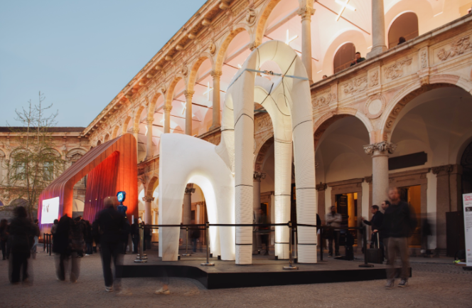 “Aevum”, meaning “eternity” in Latin, consists of two 6-meter by 6-meter offset arches. One arch is carved from solid marble; the other is created using Vertico’s large-scale 3D concrete printing system. The 3D-printed arch is composed of 21 unique elements, standing 5.6 meters tall and weighing 5.5 tons, with a printing time exceeding 6 days. The installation was completed within 7 days, with structural and manufacturing support from Carpenterie Pezzetti and Eckersley O’Callaghan.