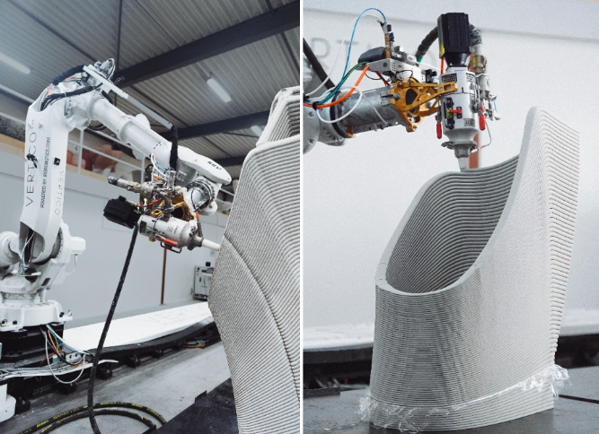 The printed structure was manufactured using Vertico’s accelerator print head mounted on a robotic rail platform. A custom Sika cement mixture enabled the production of the non-planar geometries and large cantilevers required by ZHA’s design. The printing process prioritized design accuracy within a compressed timeframe.