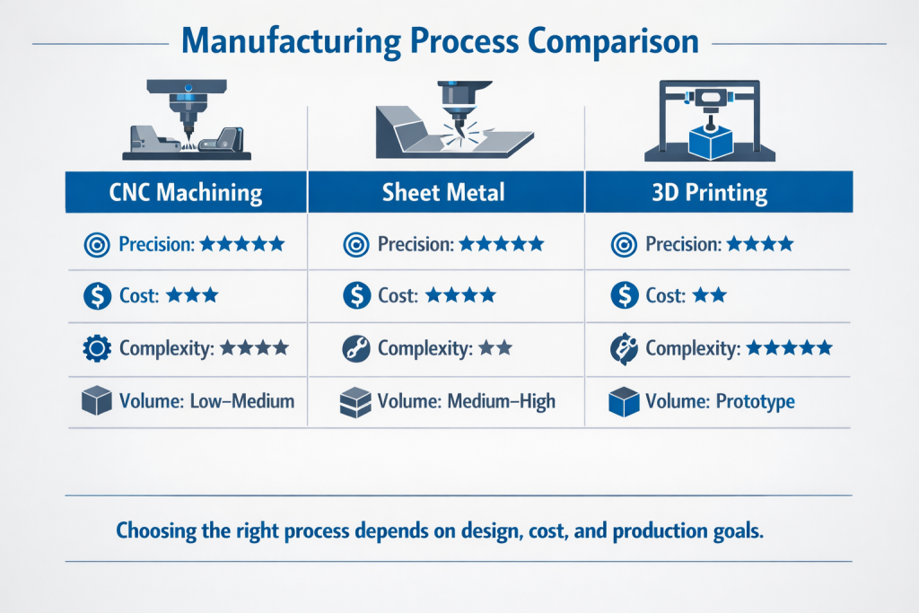 Understanding the strengths and limitations of CNC machining, sheet metal fabrication, and 3D printing allows for better engineering decisions, cost optimization, and product performance.