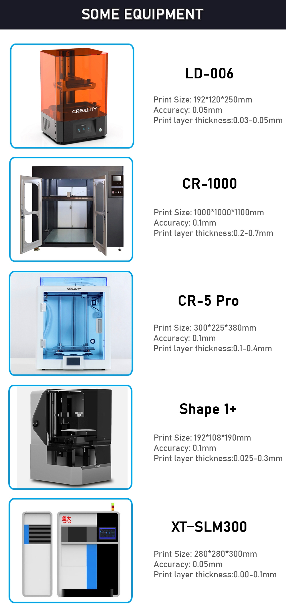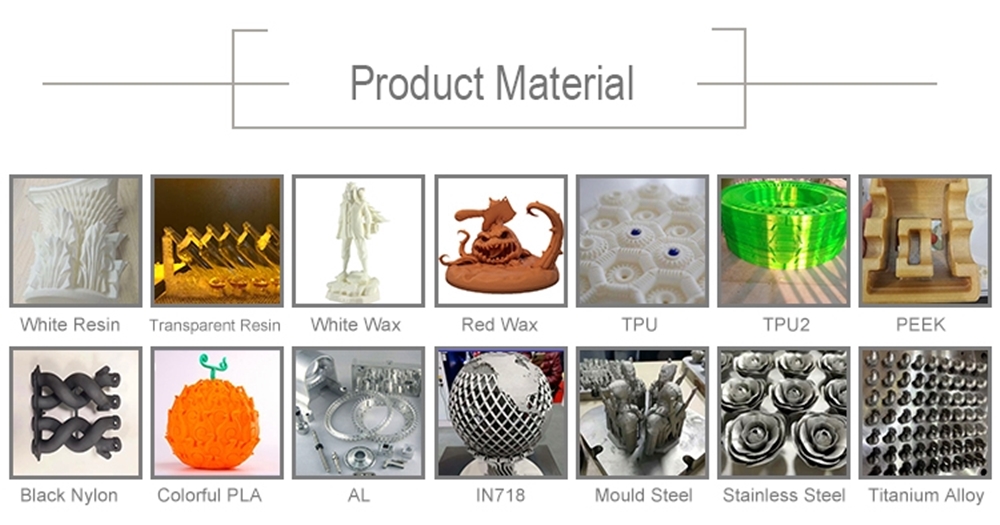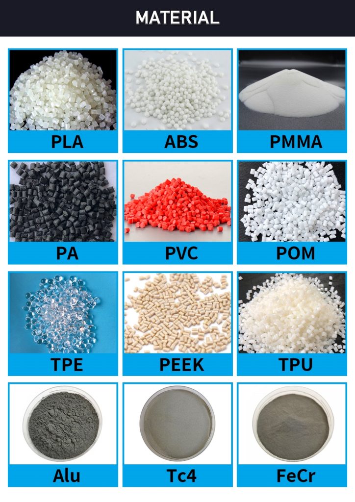 | Material | Resin, Nylon, PLA, ABS, PP, PETG, PEEK, PMMA, Carbon Fiber,Aluminum, Stainless Steel, Titanium |